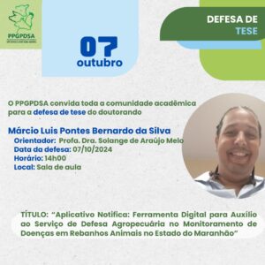 Convidamos a comunidade acadêmica para prestigiar a defesa de tese do doutorando Márcio Luís Pontes Bernardo da Silva, sob orientação da Profa. Dra. Solange de Araújo Melo no dia 07 de Outubro de 2024 às 14h na sala de aula do Programa. O titulo da tese do discente é “Aplicativo Notifica: Ferramenta Digital para Auxílio ao Serviço de Defesa Agropecuária no Monitoramento de DOenças em Rebanhos Animais no Estado do Maranhão