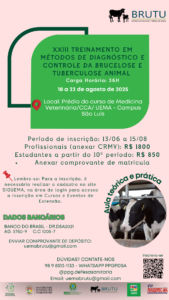 Está aberta as inscrições para o XXIII Treinamento em Métodos de Diagnóstico e Controle da Brucelose e Tuberculose Animal, promovido pelo Programa de Pós-Graduação em Defesa Sanitária Animal (PPGPDSA) da Universidade Estadual do Maranhão – UEMA.